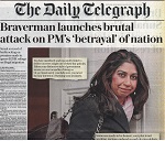 Judging by the stalwart support she has already received from the Daily Mail and the Daily Telegraph – “Braverman launches brutal attack on PM’s ‘betrayal’ of nation” (Daily Telegraph 15.11.2023) -- there is every indication that Conservative columnists and commentators will carry on applying pressure on her behalf. “Suella leads Tory Rebellion on migration” (Daily Mail, 24.11.2023)