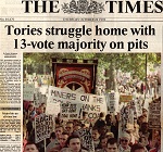 “Tories struggle home with 13-vote majority on pits,” said the headline on the front page of The Times over its report of a stormy debate in which six Conservative MPs voted with the Opposition and another five abstained.