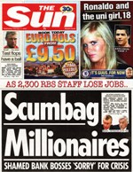 Headline writers have found Goodwin an easy prey and in the immediate aftermath of the RBS rescue he was dogged for weeks by headlines demanding an apology. When he finally said “sorry” in front of a House of Commons committee it triggered a memorable Sun headline “Scumbag Millionaires” (11 February, 2009) - a play on the title of the film of the moment, Slumdog Millionaire.