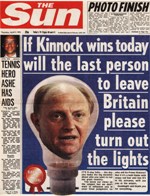 On polling day, the Sun’s editor Kelvin MacKenzie produced an infamous edition. Superimposed on a picture of a light bulb was a photograph of Kinnock’s face. Alongside the illustration was the following headline: “If Kinnock wins today, will the last person to leave Britain please turn out the lights.”